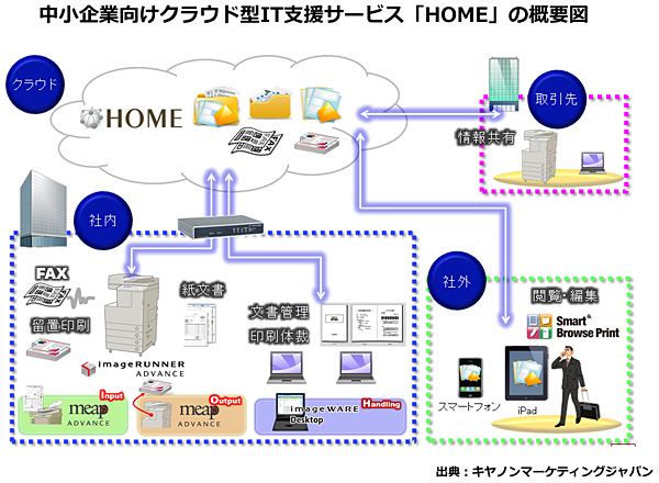 中小企業向けクラウド型IT支援サービス「HOME」の概要 クラウド型サービスの「HOME」は、社内外や取引先との情報共有やキヤノン製の複合機との連携サービス。オンラインストレージやスマートデバイス対応を大幅に強化したのに加え、リモートバックアップや安否確認サービスなどオプションサービスを拡充した。また、最小構成の税別月額料金を従来の5ユーザー3200円から2000円に下げた。