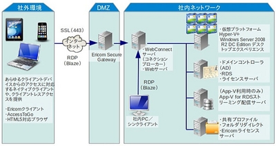 「Ericom PowerTerm WebConnect」は、RDPのパフォーマンスを数倍に向上させるだけでなく、iPad、シンクライアント端末を含むさまざまなクライアントデバイスからアクセスすることができる。ライセンス価格が他社製品の3分の1程度と導入コストを最適化した「Server-VDIソリューション」のコンセプトに合致し、一般的なVDIに比べて導入のトータルコストを半減する。