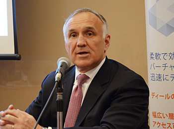ホブスピアンCEOは、M&Aで使用する機密情報をセキュアな環境の下で企業間で共有するクラウド型コラボレーションツール「IntraLinks Dealspace」を紹介。アプリケーションのなかにコミュニティを設けて、買収の相手探しから初期調査、交渉、基本合意、デューディリジェンス(詳細調査)、再度交渉、売買契約、クロージングまで、M&Aに関する一連のやり取りを実行できる。「これまでの紙ベースでのM&Aのやり取りは、複雑で時間がかかっていた。『IntraLinks Dealspace』を活用すれば、簡単・迅速に実行できる」(ホブスピアンCEO)。「IntraLinks Dealspace」は、M&A以外にも、企業分割や資金調達などの企業間の戦略的な商取引で活用されている。