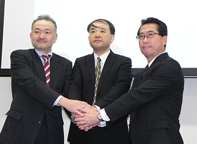 左から、テラスカイの佐藤秀哉社長、富士ソフトの野澤仁太郎常務、セールスフォース・ドットコムの保科実専務