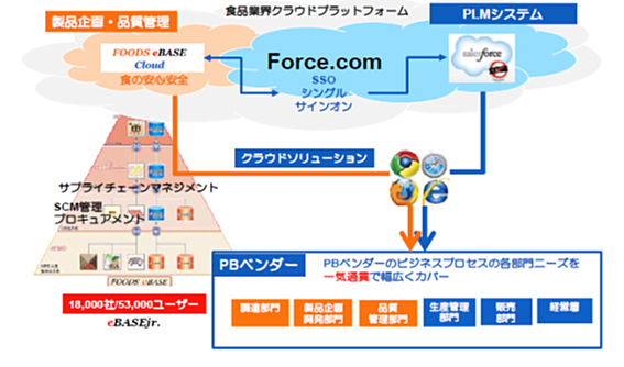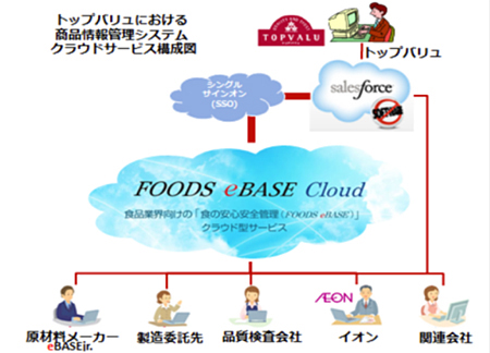 導入にあたっては、「FOODS eBASE Cloud」がセールスフォース・ドットコムのエンタープライズクラウド基盤「Force.com」上に構築した「トップバリュ」の商品全点の情報を集約し、企画から販売までのプロダクトライフサイクルを一元的に管理する「PLMシステム」ともシームレスに連携(シングルサインオン)した。eBASEの窪田勝康取締役は「『FOODS eBASE Cloud』ですべてのPB商品をつくるまでのワークフローを担い、セールスフォース上のクラウドで完成品の管理を行う」と、両クラウドサービスで最適な環境を整えることができたと語る。