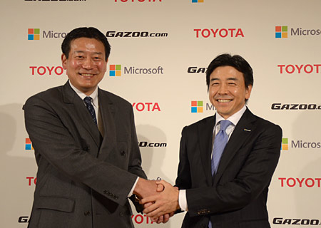 トヨタ自動車e-TOYOTA部の山田博之部長(左)と日本マイクロソフトエンタープライズビジネス担当の小原琢哉執行役常務