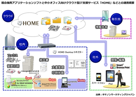 キヤノンマーケティングジャパン(キヤノンMJ、川崎正己社長)は、複合機とクラウドサービスを連携させるアプリケーションソフトを拡充する。ファックス文書管理の複合機用ソフト「せいとんファクス for MEAP ADVANCE」と、スキャナで読み取ったドキュメントを管理する「おてがるマイスキャン for MEAP ADVANCE」、中小オフィス向けクラウド型IT支援サービス「HOME」との連携を強化したパソコン用ソフト「HOME-Desktopコネクター」の3種類を6月上旬をめどに発売する。
