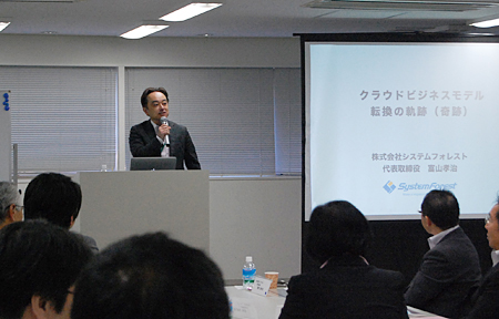 クラウドによるビジネスモデル転換の成功事例を発表したシステムフォレストの富山社長