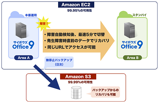 ユーザーが自社内で運用中の「サイボウズ Office」の環境を稼働保証99.95%の「Amazon EC2」上に移行し、データバックアップや障害時の自動切替えを提供するサービス。既存データを移行するので、保有するライセンスをそのままクラウド環境で運用することができる。
