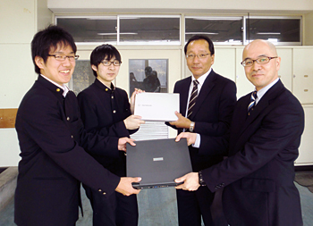 寄贈式で日本システムの荻生順一・取締役ソリューション本部長(後列右)からパソコンを受け取っているのは、北海道室蘭工業情報技術科3年生でメカトロニクス研究部部長の養父翔一さん。富樫潤・情報システム部長(前列右)からパソコンを受け取っているのは、高校プロコンで初優勝した情報技術科3年生の石橋俊文さん