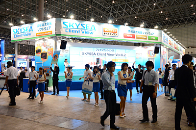 展示会場の入り口付近では、Skyがひときわ大きなブースを構え、担当者が来場者に対して熱心に声をかけていた。SKyは、クライアント運用管理ソフトウェア「SKYSEA Client View」(スカイシークライアントビュー)の最新バージョン「Ver.8.2」を展示し、大型ディスプレイを活用して機能・性能を来場者に説明していた。