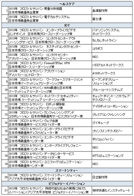 「2013年 フロスト&サリバン ジャパンエクセレンスアワード」受賞企業