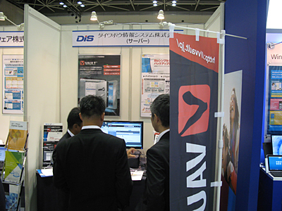 WindowsタブレットPCを並べた日本マイクロソフトのブース。エイサーの世界初の8インチタブレット端末「Iconia W3」が注目を集めた 流通卸のDISが、メーカーやクラウドサービスベンダーと協業した製品が多く出展していたのも、特徴の一つだ。例えば、オレガは自社製品のストレージ仮想統合ソフト「VVAULT Basic」でNTTコミュニケーションズと協業し、クラウドサービス「BizCITY」を使った「クラウドバックアップサービス」を月額3万9800円で提供。ディザスタリカバリやBCP対策などの用途で利用を促進する。担当者は、「大容量のストレージからソフトまで込みで、安価なバックアップを実現した。導入すれば、すぐに完全同期ができる」と語る。このサービスをDISと連携して二次店へ展開。「売り切りモデルで月額課金制だが、販社にはストックが積み上がる」と、サーバー商材の商流に乗ることを期待する。