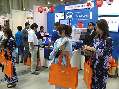 ニフティはDISと連携したパッケージで二次店にクラウドサービスを売る 前々回の「DISわぁるど」からDISとの関係を強化してきたデルは、パソコン、タブレット、サーバー、ネットワーク、液晶ディスプレイを展示。夏をイメージし浴衣姿のコンパニオンを立て、実機に触れるよう誘導していた。担当者は、「液晶ディスプレイは国内シェアNo.1だが、あまり知られていない。2年前から統合ソリューションベンダーであることを宣言しているが、とくに東北地方では認知度が低いので、今回の『DISわぁるど』で知られるようにしたい」と述べ、DISと連携した「認定販売店プログラム」の紹介もあわせて行っていた。