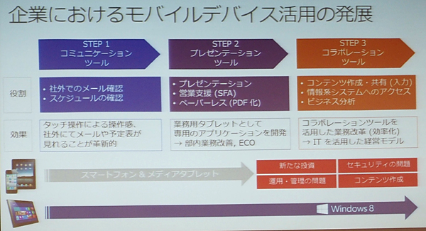辻本氏が示した「企業のモバイルデバイス活用の発展ステップ」。日本企業の多くは「STEP2」と「STEP3」の間に位置するという