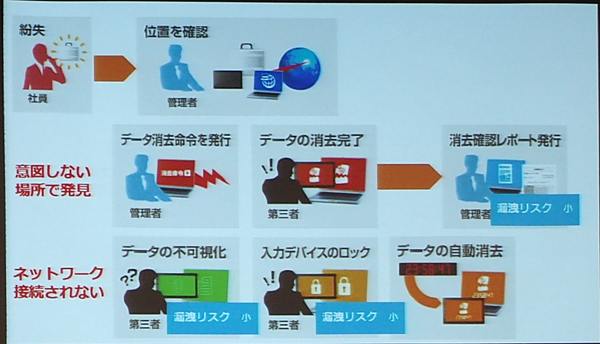 ワンビが開発・販売するデータの遠隔消去ソリューションは、万が一パソコンをなくした場合に、遠隔地から情報システム管理者が消去できるソリューション。モバイル端末の利便性とセキュリティを両立した製品で、加藤社長はその有効性をデモで紹介した。