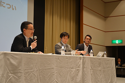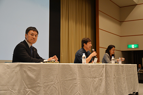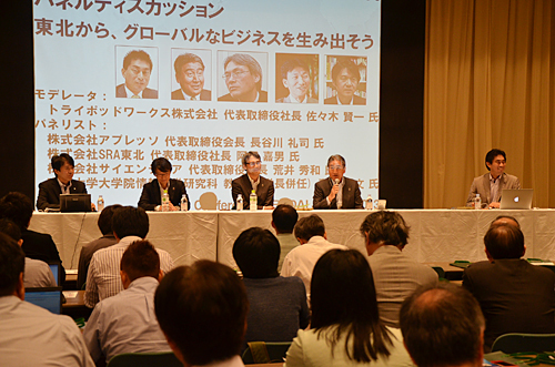最後に、「東北から、グローバルなビジネスを生み出そう!」と題し、アプレッソの長谷川礼司会長、SRA東北の阿部嘉男社長、サイエンティアの荒井秀和社長、東北大学大学院情報科学研究科の青木孝文教授がパネルディスカッション。トライポットワークスの佐々木賢一社長がモデレータを担当した。