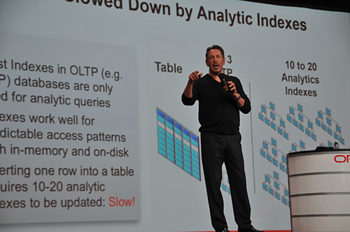 エリソンCEOは、昨年度の決算会見でハード社長が簡単に触れたインメモリDBについて語り始め、1時間のもち時間のうち半分をこれに費やした。そのうえで、「過去5年間、データベースの革新はクエリ(DB管理システムに対する処理要求を文字列として表したもの)のプロセスを検証してきたことで生まれた。当社のインメモリDBは、新しいアイデアを駆使したことで、従来よりクエリが100倍以上速い。行のフォーマットに同じデータをアレンジしてカラム(各レコードに含まれるデータの種類を示すもの)に反映し、両方をメモリに入れた」と述べ、性能の違いを実現する技術力を誇示した。