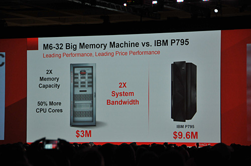米IBMの競合製品「IBM Power 795」と比較した 一方、「Mシリーズ」の新製品として、オラクルが「Big Memory Machine」と呼ぶサーバー「M6-32」を同日発売すると発表した。「M6-32」は、サン・マイクロシステムズの系譜を受け継ぐ「SPARC M5-32サーバー(M5)」の後継製品で、「M5」の倍のコアを搭載。「SuperCluster」方式での提供も行う。競合製品として米IBMの「IBM Power 795」をスライドで示しながら、費用対効果が2倍に達することをアピールした。