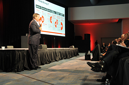マーク・ハード社長はいつものように壇上から降り、パートナーと同じ目線で戦略を語った ハード社長は、初日の午前中、世界のパートナーが集うOPNの基調講演に登場。「すでに、世界では90億個のデバイスがインターネットにつながっている。『Internet of Things(IOT=モノのインターネット)』の時代に入り、データ量は爆発的に増えている」と、今後のパートナービジネスでは、IOTとビッグデータ、モバイル環境がキーワードになるとした。また、現況にも触れ、「インテルベースのサーバーは世界市場での販売が80万台で、成長は鈍い。一方で、ITインフラのコストと複雑さが低減するように事前統合したオラクルの『Oracle Engineered Systems』は、ビッグアカウントを中心に導入が進み、年率60%の成長を遂げている」と、オラクルの垂直統合型製品が急速に成長していることを明らかにした。