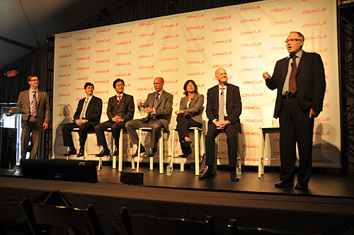 渡部洋史執行役員(左から3番目)が日本市場の現況を語った OPNのプレス向けセッションには、日本オラクルの渡部洋史執行役員アライアンス統括がパネラーとして登壇。「グローバルで展開している『Specialization』は、日本市場でも拡大している。販売面では、富士通などが日本のグローバル企業の『Oracle Engineered Systems』導入で貢献している。日本では、今年度、クラウドサービスを広げる」と語った。(谷畑良胤)