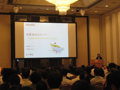 セミナー会場では、基調講演で「消費税アップ対策セミナー」と題し、長野にある税理士法人の税理士が講演。指定日(10月1日)を経過した段階だが、施行日(14年4月1日)までに確認すべき経過措置や施行日前後の取引、システム面の課題など、最新事例を織り交ぜて留意点を解説した。講演は、当初は机を配置したスクール方式を予定していたが、申し込みが殺到したために机を片づけ、急きょシアター方式で実施。ユーザー企業の関係者ら200人以上で満杯になった。