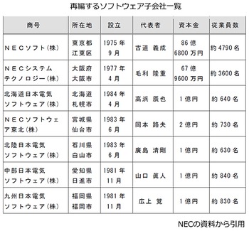 NECは、国内のソフトウェア開発子会社7社を再編し、2014年4月1日付で新会社を発足させる。再編対象は、NECソフト、NECシステムテクノロジー、北海道日本電気ソフトウェア、NECソフトウェア東北、北陸日本電気ソフトウェア、中部日本電気ソフトウェア、九州日本電気ソフトウェア。これまで分散していたSE(システムエンジニア)・技術・ノウハウなどの経営資源を集約し、社会インフラ分野などの成長領域への対応を強化する。