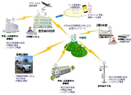 豊見城市は、これまでデジタル防災行政無線と、広報車による防災・行政情報の発信を行ってきた。整備した「防災情報システム」では通信手段の強化を図り、公共施設、小・中学校、幼稚園、保育園等の放送拠点の拡充、映像による災害情報の取得、J-ALERT(全国瞬時警報システム)からの災害情報や市発信の避難指示を防災無線や携帯電話メールなどに一斉配信する。さらに、電話やウェブ、メールから防災情報の聞き直しなどに対応し、公衆網に依存しない災害に強いシステムを構築した。