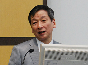 決算会見で業績を説明する大塚裕司社長