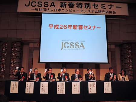 大手ハードメーカー7社が、2014年の製品・販売戦略を発表した。日本コンピュータシステム販売店協会(JCSSA、大塚裕司会長)が、1月21日に都内で開いた新春特別セミナーの恒例企画で、協会員の販売パートナー向けに“自社の売り”をプレゼンテーションした。