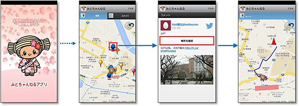 「みとちゃんねるアプリ」は、現在位置を示すナビゲーション地図と連携して、観光ガイドなどの情報を表示。SNS(ソーシャル・ネットワーキング・サービス)の投稿を自動で収集し、投稿情報をナビゲーション地図上や一覧形式で表示する。投稿された情報は、PCなどのウェブブラウザでの一覧表示にも対応している。
