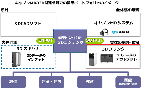 キヤノンMJは、国内3Dプリンタ市場を、装置本体と材料、保守サービスを含めて2016年には340億円規模になると予想しており、うち同社がターゲットとする法人向け3Dプリンタ市場は260億円とみている。キヤノンMJは法人向け3Dプリンタ市場のシェア20%の獲得を目指しており、16年には関連サービスを含む売上高を100億円規模に拡大する計画を立てている。(安藤章司)