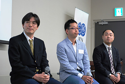 左から、サイボウズ執行役員の札辻秀樹システムコンサルティング本部長、ジョイゾーの四宮靖隆代表取締役、アリーナシステムの宇野里システム開発部マネージャー