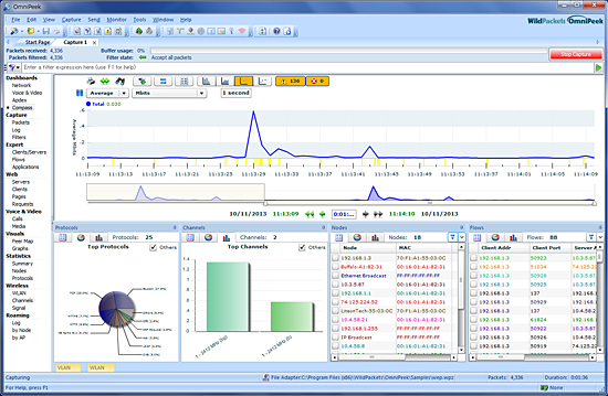 「OmniPeekシリーズ バージョン7.9.5」の画面 IEEE802.11ac無線LANの3ストリームトラフィックキャプチャと解析ができる無線LAN解析ソリューション。ネットワーク管理者は、IEEE802.11acを利用したギガビット無線LANが、ポリシーにもとづいて正しく設定されているか、正当なパフォーマンスが出ているかなどの情報を得て、業務に支障をきたすことなく、快適なギガビット無線LAN環境を容易に運用管理することができる。