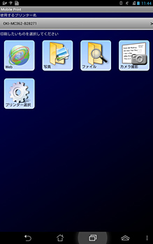 「Mobile Print」の基本画面 これまでAndroid OS搭載モバイル端末からの印刷は、OKIのA4カラーLED複合機(MC562dnw/MC362dnw)で、Googleが提供するプリント機能「Google Cloud Print」に対応していた。今回開発した「Mobile Print」は、クラウドサービスなどを介さずに、Android OS搭載モバイル端末からネットワーク上のOKIのLEDプリンタ・LED複合機を検索し、ダイレクト印刷ができる。