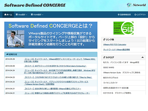 「Software Defined CONCIERGE」は、ウェブ上でサイジングや概算見積もり計算、情報収集ができ、パートナー企業の営業担当者が顧客に迅速な対応ができるように支援するサービス。パートナー企業は、簡単な入力だけで「VMware Virtual SAN」と「VMware Horizon View」のサイジングをウェブ上で行い、出力結果をそのまま使用して、ネットワールドからの詳細見積もりを受け取ることができる。