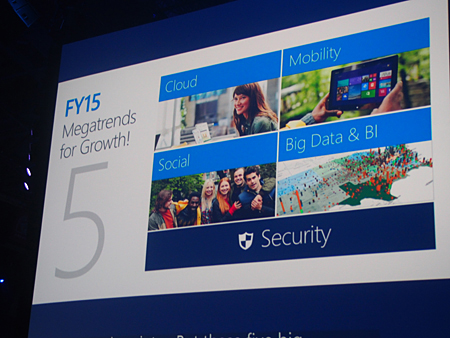 冒頭、ターナーCOOは、今年2月に就任したナデラCEOが打ち出した「モバイルファースト」「クラウドファースト」というキーコンセプトを強調したうえで、ITビジネスを成長させるカギになる五つのメガトレンドを紹介した。「これまで掲げてきた『クラウド』『モバイル』『ソーシャル』『ビッグデータ&BI』に、今年から『セキュリティ』を加えた。これらのトレンドは、過去にはないビッグチャンスを私たちとパートナーにもたらす」と話し、それぞれのトレンドでのマイクロソフトの優位性を語った。