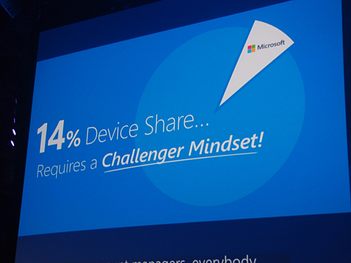 ターナーCOOは、ライバルに後れを取っているモバイル端末にも言及。全世界・全デバイスのなかで、マイクロソフトのシェアは14%という数字を披露した。「PCでは90%を超えるシェアをもっているものの、全デバイスでは14%程度。この数字は、私たちが挑戦者であることと、将来に大きな可能性があることを意味している」と説明した。