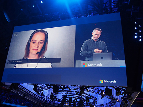 IoTの具体化ソリューションとしてエレベータ管理会社のビッグデータソリューションを紹介 一方、翻訳機能では、「Skype」と研究開発中の翻訳機能をデモを交えて紹介。ドイツ語を話す人と、英語を話す人がSkypeのテレビ電話で会話。システムが互いの言語を瞬時に自動翻訳し、スムーズなコミュニケーションを実現するデモを披露した。ナデラ氏は「この技術はさまざまなシーンで応用できる」と説明し、「今年末にはプレビューを利用してもらえるようにしたい」と述べた。