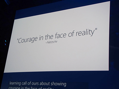 最後に示したのは哲学者ニーチェの言葉だった CEOに就任後、ナデラCEOがWPCで初めてスピーチをするとあって、ビッグニュースを期待する声が多かったが、実際には大きなニュースはなかった。また、スティーブ・バルマー前CEOは大きな声を張り上げてパートナーを鼓舞するダイナミックなパフォーマンスが特徴だったが、ナデラCEOは静かにていねいに話すスタイル。スピーチパフォーマンスが対照的であることも印象的だった。