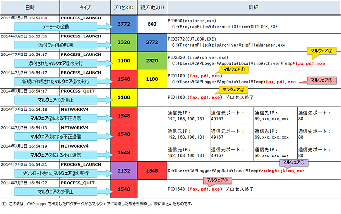 「CAPLogger」のログ記録例 東京電機大学未来科学部情報メディア学科の佐々木良一研究室とディアイティの共同研究で開発したソフトウェア。PCで実行する通信のログを単純に記録するだけでなく、すべてのプロセスと通信情報を紐づけ、通信を見える化する。これによって、IPSなどでマルウェアが検知された際も、PC内のマルウェアプログラムの特定、関連プログラムの存在、マルウェアの起動原因などを迅速・容易に把握することができる。