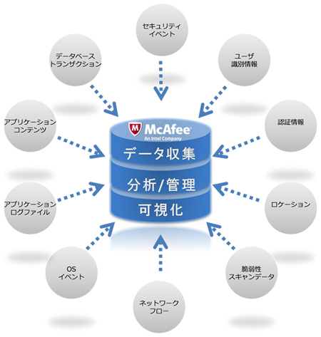 各種サーバー、ネットワーク機器、セキュリティ製品などのログを収集して一元管理するとともに、それらのログの相関関係を分析するソリューション。ログの分析に特化した専用データベースを利用し、収集した大量のログを高速処理する。1日に20億件以上のマルウェア情報を収集しているMcAfeeの外部脅威情報データベース(GTI)と連携することで、標的型攻撃をすばやく発見する。