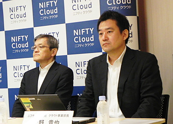ニフティの三竹兼司社長(左)と上野貴也クラウド事業部長 また、「企業ユーザーはハイブリッドクラウドのニーズが大きい」(上野貴也クラウド事業部長)ことから、ニフティクラウド事業で重視している企業ユーザーのニーズへの対応を強化する。2010年時点では、約8割がゲームなどエンタテインメント系のユーザーだったが、直近は7割近くを企業ユーザーが占めている。こうしたことから、伸びしろが大きい企業ユーザー向けのサービスを拡充する。(安藤章司)
