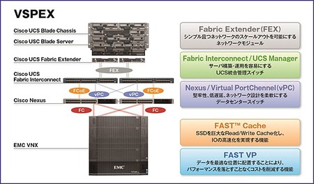 「VSPEX」は、EMCが提供する実証済みリファレンス・アーキテクチャ。「EMC VNX5400」ストレージと、IAサーバー「Cisco Unified Computing System(UCS)」、スイッチ「Cisco Nexus」で構成し、小売業向けCRM(顧客関係管理)/SCM(サプライチェーンマネジメント)サービス基盤として、9月に本格稼働する。