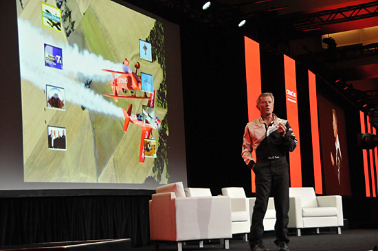 ここ数年のOOWのスケジュールと同じく、日曜日の初日(9月28日)は、夕方のエリソンCTOが登壇する前、OPNの関係者を集めた基調講演があった。最初にオラクルの冠を背負った飛行機でアクロバットフライトをするエアショーパイロットのショーン・タッカー選手が登場し、「常に目標を達成する卓越性を備えた『チームワーク』が重要だ」と、パイロットとして一人で飛行するだけでなく、チームの重要性を述べて、パートナーたちを奮い立たせた。