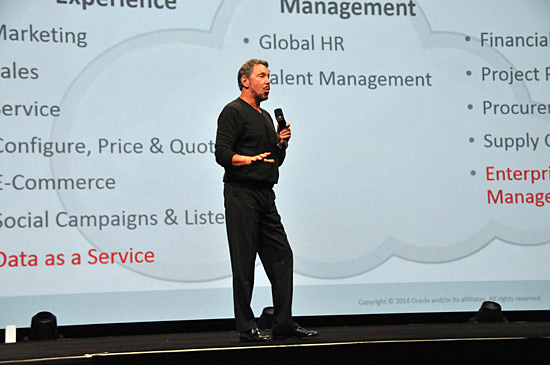 実際にSaaSのサービス数では、この1年でタレントマネジメント、ヒューマンリソースマネジメント(HCM)、eコマースなどで、他社に追随してクラウド化を完了。SaaSアプリケーション数でSFDCなどを上回ったという。また、SFDCや、ERP(基幹業務システム)、CRM(顧客関係管理)、eコマースをクラウドで提供するネットスイート、SAPなどを取り上げ、「有力クラウドベンダーのインフラ(IaaS)は、ほとんどがオラクルプラットフォーム(Oracle Engineered Systemsなど)だ」と勝ち誇った口調で述べ、「IaaS、PaaS、SaaSのすべてをマルチテナントで利用でき、ボタン一つでオンプレミスのソフトウェアがクラウド化できるのはオラクルだけ」と、競合を見下ろし加減で語った。