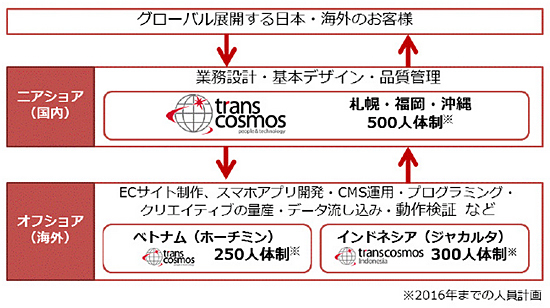 トランスコスモスは、これまで札幌・福岡・沖縄にあるニアショア拠点を中心にウェブ制作・開発を行ってきた。これに加えて、ITリテラシーの高い人材を安価で大量に採用できるベトナムとインドネシアに拠点を設けることで、多言語に対応したグローバルサイトの構築・運用サービスの提供を強化する。