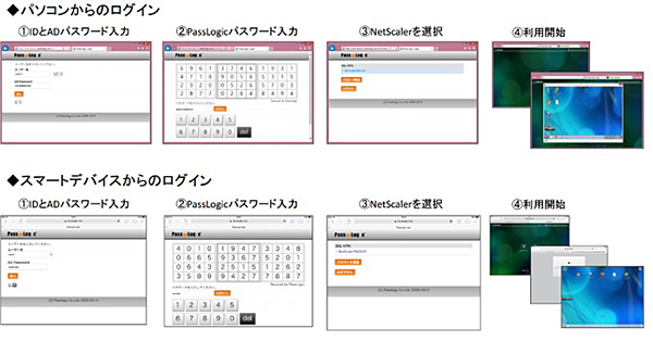 利用者は、「NetScaler」のリモートアクセスモジュールである「NetScaler Gateway」を経由して、「XenDesktop」「XenApp」にサインオンする際、「PassLogic」認証からの「NetScaler Gateway」操作の一連のプロセスが、ウェブブラウザだけで完結する。ウェブブラウザの画面カスタマイズは一切不要で、簡単な設定だけで「NetScaler」とのシングルサインオン連携を実現する。