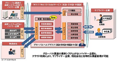 従来の「TWX-21 Web-EDI Globalサービス」は、海外拠点に生産・調達を管理する基幹システムをもつバイヤー企業が対象で、バイヤー企業が基幹システムのインターフェースから「TWX-21」へ接続して、見積登録や購買登録、進捗確認、納期調整などを行う仕組みだった。これに、調達・物流プロセスをインターネット上のポータル画面からできる「購買・物流機能」を追加。基幹システムをもたないバイヤー企業が利用できるようになる。