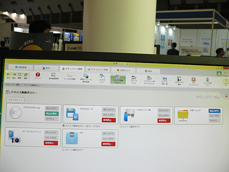 マクニカネットワークスの「remotium」はスマートデバイスにデータを保存せずにアプリケーションを操作できる ミロク情報サービスは、IT資産管理アプライアンス「SOXBOX NX」をアピール。ブースでは、アプライアンス1台でパソコンの利用を監視してUSBメモリなどの利用を禁止したり、ウェブフィルタリング機能でインターネット経由での情報漏えいリスクを軽減したりできると提案していた。