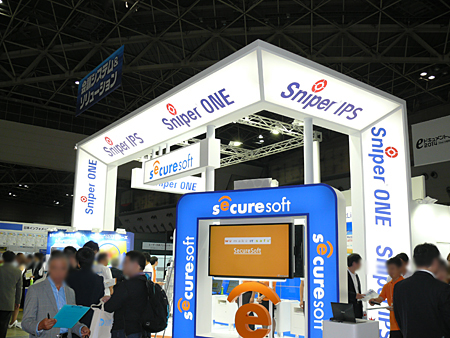 「SecureSoft Sniper ONE」を前面に押し出したセキュアソフトのブース ユニークな製品・サービスも多かった。TDCソフトウェアエンジニアリングは、「和製タレントマネジメントシステム」と銘打って「HuTact」を展示。業種ごとの人事評価・人材管理指標に対応し、日本企業に多い縦割り組織による人材の不透明化を解消するという。データセンターをアピールしていたのは九州電力グループのキューデンインフォコム。2015年にオープンする「データセンター福岡空港」のメリットを説明していた。