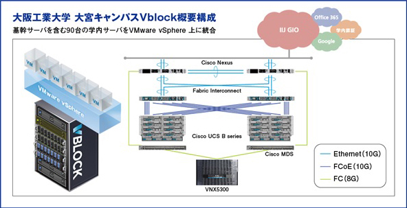 新システムは、ネットワーク関連の基幹サーバーを含む90台の業務サーバーを「VblockSystem 320」に集約。Office365やGoogle Apps、学術情報ネットワーク「SINET」との接続機能などを提供する外部クラウドサービスとも組み合わせて、先進的なハイブリッドクラウド構成を実現した。