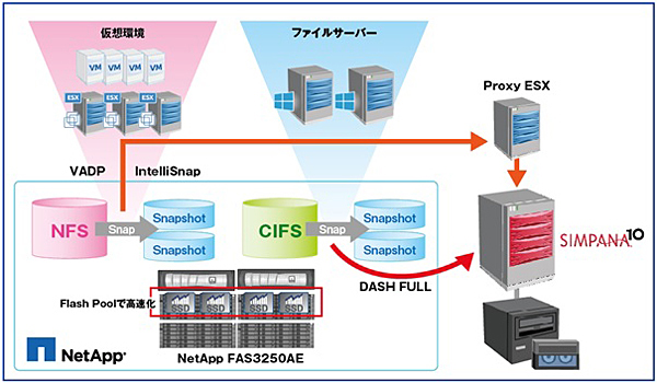 新しいバックアップシステムは、従来2台の装置を利用していたストレージを「NetApp FAS3250」に統合。1次バックアップをNetAppの「Snapshot」機能で取得して、2次バックアップを「Simpana」によるD2Dバックアップで実施。さらに磁気テープへバックアップをする運用に変更した。