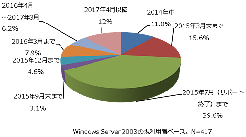 日経BPコンサルティングが今年9月11~16日に実施した調査「Windows Server 2003サポート終了への対応状況調査」によると、Windows Server 2003を利用している回答者の3分の1(33.8%)が、リプレース作業の完了が「サポート終了より先になる」と回答。2015年4~7月のぎりぎりで間に合わせる企業が4割という結果だった。